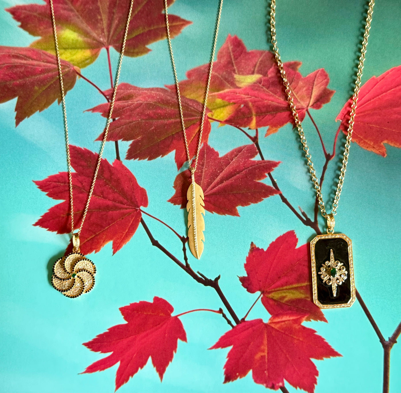long necklace of gemstones inside gold tone rings.